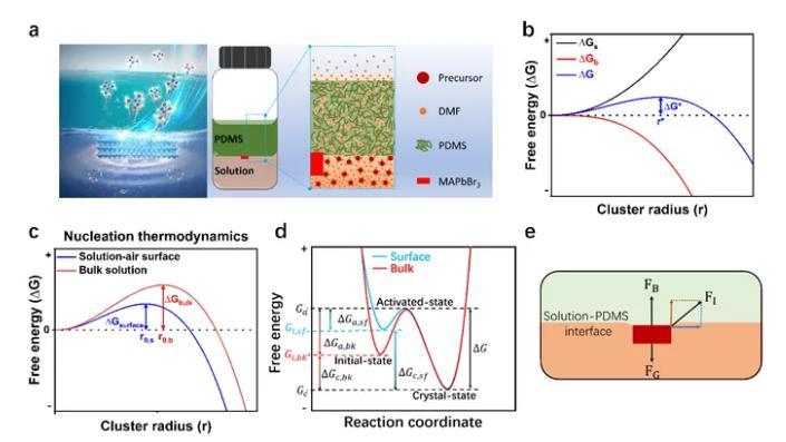 圖2.MAPbBr3鈣鈦礦結(jié)晶與晶體生長(zhǎng)。(a)PDMS輔助結(jié)晶原理圖;(b)形核半徑與自由能的關(guān)系;(c)溶液的表面和內(nèi)部的形核半徑的比較;(d)生長(zhǎng)過(guò)程中自由能變化圖解;(e)界面懸浮生長(zhǎng)的力學(xué)圖解。