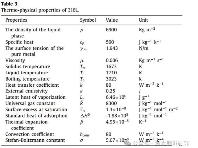 圖1(A)中顯示了計(jì)算領(lǐng)域的圖形說明。計(jì)算域的大小設(shè)置為20 mm×2 mm×25 mm。計(jì)算域劃分為1.25億個(gè)邊長(zhǎng)為0.02 mm的六面體網(wǎng)格。在初始狀態(tài)下,將厚度為20 mm的下部設(shè)置為工件層(階段2),將厚度為5 mm的上部設(shè)置為環(huán)境空氣層(階段1)。前壁(Y=0)被設(shè)置為對(duì)稱邊界條件,頂面(Z=25 mm)被設(shè)置為壓力輸出邊界條件,其他表面被定義為壁邊界條件。使用了Ansys-FLUENT®軟件用于模擬。采用C語(yǔ)言編寫的用戶自定義函數(shù)(UDF)實(shí)現(xiàn)光線跟蹤過程。圖1(B)顯示了光線追蹤過程的驗(yàn)證案例,在該案例中,一束平行光束被射入具有不同表面粗糙度的方腔。圖1(C)表明,在高Ra條件下,隨著表面粗糙度的變化,能量分布明顯改變,更多的能量集中在第一反射區(qū)。表3列出了模擬中使用的物理特性。