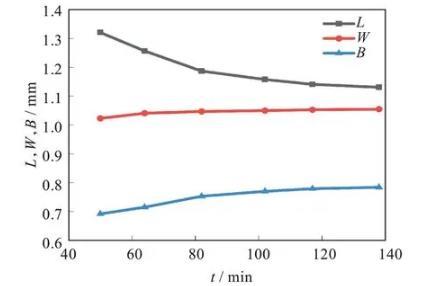 圖7為數(shù)值仿真過程中液滴三軸隨時間演化規(guī)律。綜合對比圖4和圖7,數(shù)值仿真軟件與實驗過程中球形液滴的三軸長度變化趨勢基本一致。可以看出,在體積保持不變的假設下,球形液滴的第二半軸和第三半軸變形頻帶是不一致的。該結(jié)果表明一些黏彈性液滴的變形和收縮不嚴格符合仿射變形假設(即第三半軸W始終等于第二半軸B),這與文獻結(jié)果類似。數(shù)值仿真結(jié)果中液滴最終形態(tài)不是一個三軸長度相等的球形,主要原因是仿真過程中使用的非牛頓流體的本構(gòu)模型只對黏性項進行了修改,而忽視了彈性應力的影響,因此與理論計算結(jié)果有一定誤差。