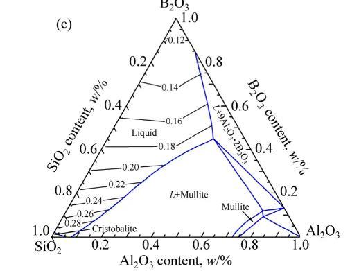 1873K時含B2O3三元體系等溫相圖及液相線如圖4所示。實際條件下,Si常存在于金屬相中,而SiO2則以硼硅酸鹽的形式存在于熔渣中,因此,SiO2添加對含B2O3三元體系熱力學性質(zhì)的影響仍有待確定,MgO-B2O3-SiO2、CaO-B2O3-SiO2和Al2O3-B2O3-SiO2三元系相圖也需要進一步優(yōu)化。1873K時含B2O3三元體系熔渣等表面張力線如圖4所示。結(jié)果表明,在MgO-B2O3-SiO2體系和CaO-B2O3-SiO2體系1873K完全液相區(qū)(Liquid II)范圍內(nèi),熔渣表面張力值在0.15~0.45 N/m范圍內(nèi);隨著B2O3含量的增加,表面張力顯著降低;隨著SiO2含量、MgO含量和CaO含量的增加,熔渣表面張力逐漸增大,但MgO含量和CaO含量對表面張力的影響更加顯著。在Al2O3-B2O3-SiO2體系1873K完全液相區(qū)(Liquid)范圍內(nèi),熔渣表面張力在0.10~0.30 N/m范圍內(nèi);熔渣表面張力隨B2O3含量的增加而逐漸減小,隨SiO2含量和Al2O3含量的增加而逐漸增大。