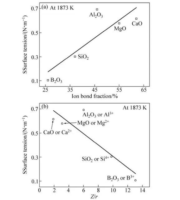 純氧化物表面張力主要與離子間的鍵能有關(guān),形成氧化物的離子的靜電勢(Z/r)大,且離子鍵分數(shù)高的氧化物有較大的表面張力。純組分氧化物的靜電勢和離子鍵分數(shù)如圖3所示。純液態(tài)B2O3屬于表面活性物質(zhì),在1873 K時的表面張力約為0.104 N/m,僅為MgO、CaO、Al2O3和SiO2同溫度純物質(zhì)表面張力數(shù)據(jù)的1/6~1/3。Si4+和B3+離子雖然靜電勢很高,但其離子鍵分數(shù)較低(<50%),易形成共價鍵高、靜電勢小的絡(luò)離子,從而其表面張力值較?。籑g2+、Ca2+和Al3+離子雖然靜電勢較小,但離子鍵分數(shù)較高,從而具有較高的表面張力值。