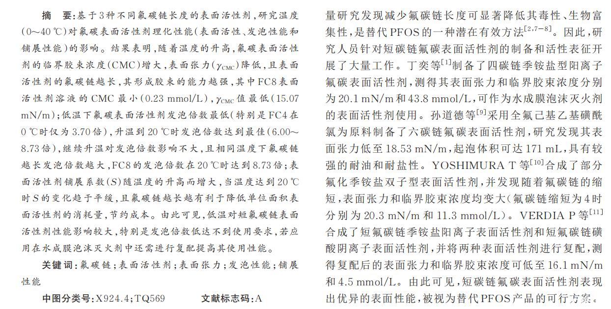 然而低溫環(huán)境可能影響短碳鏈表面活性劑的性能,特別是在機場消防應用領域。我國機場分布跨度大,冬夏季消防水源溫度差異顯著(0~40℃)。因而,研究不同溫度下氟碳鏈長度對表面活性劑性能的影響具有重要意義。筆者在0~40℃溫度下,研究四、六、八氟碳鏈表面活性劑(分別記為FC4、FC6、FC8)的表面活性、發(fā)泡性能、鋪展性能等主要理化性能,為氟碳表面活性劑在環(huán)保型水成膜泡沫滅火劑中的應用提供參考。