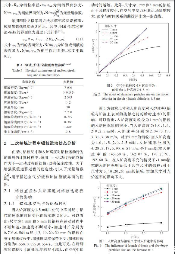 摘要: 二次精煉過程中,鋁是鋼液進(jìn)行脫氧及合金化的主要物料之一,但純鋁的密度小于鋼液,能否穿越渣層與鋼液接觸及接觸時間對鋁的脫氧效果和鋼中溶解鋁的含量有直接影響。在忽略鋁的熔化、溶解及化學(xué)反應(yīng)的情況下,通過對鋁粒運(yùn)動過程受力分析,建立鋁粒在氣-渣-鋼相內(nèi)的三維運(yùn)動數(shù)學(xué)模型,明晰鋁粒尺寸及入爐高度對鋁粒運(yùn)動軌跡的影響。