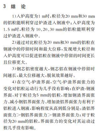 結(jié)果表明:在渣層厚度為70 mm且入爐高度為1~1.5 m的情況下,1 mm和5 mm的鋁粒在渣鋼界面處波動;入爐高度為1 m時,粒徑為10 mm的鋁粒停留在渣鋼界面處,但在入爐高度為1.5 m及以上時可以進(jìn)入鋼液;20 mm及以上尺寸的鋁??梢赃M(jìn)入鋼液。在入爐高度為1 m時、30 mm尺寸的鋁粒在鋼液中的停留時間與深度相較于20 mm的基礎(chǔ)上分別增加22.86 %和50.00 %;在鋁粒尺寸為20 mm時、入爐高度為1.5 m時的鋁粒在鋼液中的停留時間與深度在1 m的基礎(chǔ)上分別增加5.71 %和10.00 %。