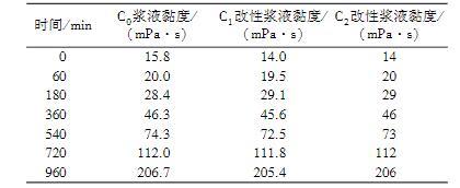 3.1表面活性劑對漿液黏度時(shí)變性的影響研究3種漿液在23℃條件下黏度隨時(shí)間變化關(guān)系見表2??梢钥闯觯?種漿液的黏度均隨時(shí)間的增長而逐漸變大,表面活性劑對漿液的初始黏度以及不同時(shí)間的黏度影響很?。ㄗ畲笞兓?.8mPa
