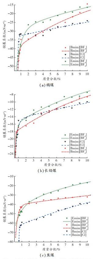 2)3種咪唑類離子液體的鋪展系數(shù)隨離子液體質量分數(shù)的增大而迅速增大,長焰煤的親水能力最好,而焦煤的親水能力最差,這與煤中親水基團和疏水基團的含量有關;
