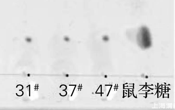 圖4的層析結(jié)果顯棕色,說明菌株31#、37#和47#所產(chǎn)的生物表面活性劑均為糖脂。由圖5可知,菌株31#、37#和47#所產(chǎn)的生物表面活性劑經(jīng)酸解后顯棕色斑點(diǎn),且Rf值與鼠李糖的Rf值相同,說明菌株31#、37#和47#所產(chǎn)的生物表面活性劑的糖基均為鼠李糖。