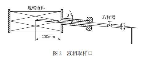 全塔共設(shè)有4個取樣口。1#取樣口設(shè)在塔頂回流處;2#取樣口設(shè)在距填料底部1200mm處;3#取樣口設(shè)在距填料底部400mm處;4#取樣口設(shè)在填料段以下。填料段的取樣口,即2#、3#取樣口的樣式如圖2所示。取樣器沿水平方向向上傾斜3°放置,伸入填料段的部分為半圓管,長度為200mm,直徑為10mm。這樣設(shè)計(jì)以保證液相樣品順利地由填料中取出,且取出的液相樣品具有代表性。