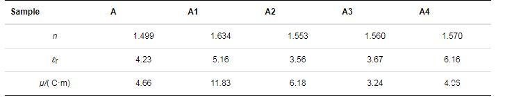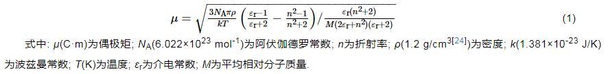 式中:μ(C·m)為偶極矩;NA(6.022×1023mol-1)為阿伏伽德羅常數(shù);n為折射率;ρ(1.2 g/cm3)為密度;k(1.381×10-23J/K)為波茲曼常數(shù);T(K)為溫度;εr為介電常數(shù);M為平均相對(duì)分子質(zhì)量。
