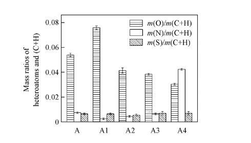 表1列出了瀝青質(zhì)及其亞組分的元素組成分析結(jié)果,其中,O的元素組成通過(guò)差減法獲得。由表1可知,這些組分主要由C和H元素組成,雜原子(O,N,S)含量較低,與文獻(xiàn)報(bào)道的瀝青質(zhì)元素分析結(jié)果一致。雜原子與碳原子和氫原子的質(zhì)量比m(O)/m(C+H),m(N)/m(C+H)和m(S)/m(C+H)值(見(jiàn)圖2),可以反映瀝青質(zhì)及其亞組分間雜原子比例的變化。比值越高,瀝青質(zhì)及其亞組分的極性越高。由圖2可知,在瀝青質(zhì)及其亞組分之間,m(O)/m(C+H)值變化明顯,其中,A1的m(O)/m(C+H)值最高,A和A2的m(O)/m(C+H)值高于A3和A4的;除A4的m(N)/m(C+H)值明顯較高外,其余m(N)/m(C+H)和m(S)/m(C+H)值變化均較小。由以上分析可知,A1的極性最高,而A3的極性最低。