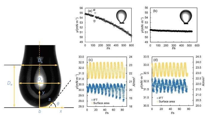 研究團隊優(yōu)化了從樣品預(yù)處理、儀器改進、實驗測量到數(shù)據(jù)分析的全流程,提供了詳細的實驗操作指南,涉及液滴控制、系統(tǒng)校準(zhǔn)和光學(xué)干擾處理等關(guān)鍵步驟。通過對氣水兩相和氣水油三相體系實際測量的有效數(shù)據(jù)和無效數(shù)據(jù)的展示和分析,驗證了方法的有效性和準(zhǔn)確性。整套實驗流程可基于不同實際條件在數(shù)天內(nèi)完成。圖2動態(tài)懸滴表征(左圖);界面張力及界面流變性實驗測量數(shù)據(jù)(右圖)本研究為界面性質(zhì)的測定樹立了新的標(biāo)準(zhǔn),通過優(yōu)化動態(tài)懸滴表征方法,極大地提高了測量的可靠性和精度,體現(xiàn)了方法學(xué)創(chuàng)新;不僅對界面科學(xué)的基礎(chǔ)理論發(fā)展具有重要推動作用,同時為材料科學(xué)、化學(xué)工程、環(huán)境科學(xué)等領(lǐng)域的實際應(yīng)用提供了技術(shù)支撐。