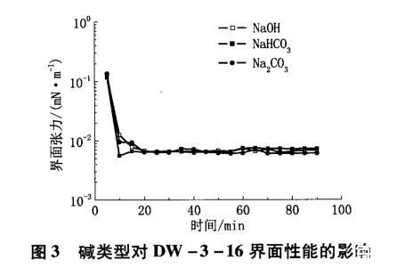 三元復(fù)合驅(qū)中注入堿能引起地層黏土分散、運(yùn)移,導(dǎo)致地層滲透率下降,堿與油層流體及巖石礦物反應(yīng),可形成堿垢,對地層造成傷害,會引起油井結(jié)垢,影響油井正常生產(chǎn);加入堿能大幅降低聚合物的黏彈性。因此,堿對DW-3-16表面活性劑性能的影響至關(guān)重要。