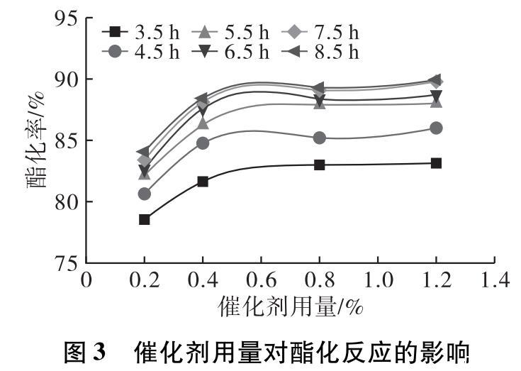 在投料比1∶1,預(yù)熱溫度80℃,預(yù)熱時間5 min,催化劑選擇4?型分子篩,反應(yīng)溫度140℃,反應(yīng)時間8.5 h,催化劑用量分別為0.2%、0.4%、0.8%、1.2%條件下進行酯化反應(yīng)。反應(yīng)3.5 h后每隔1 h取樣測試產(chǎn)物酸價,計算酯化率隨時間的變化,結(jié)果如圖3所示。