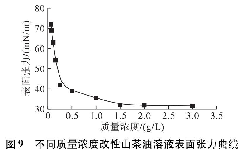 對不同質(zhì)量濃度的改性山茶油溶液進行表面張力測試,結(jié)果如圖9所示。