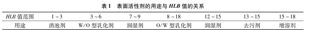HLB值可用來衡量表面活性劑的親水親油性的大小,HLB值越大代表親水性越強,HLB值越小代表親油性越強,HLB值的轉(zhuǎn)折點為10,HLB值大于10一般為親水性,HLB值小于10為親油性,人們一般以HLB值為標準指導(dǎo)表面活性劑的實際應(yīng)用(見表1)。
