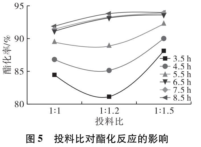 在投料比分別取1∶1、1∶1.2、1∶1.5,預(yù)熱溫度80℃,預(yù)熱時間5 min,0.4%的4?型分子篩催化劑,反應(yīng)溫度180℃,反應(yīng)時間8.5 h條件下進行酯化反應(yīng)。反應(yīng)3.5 h后每隔1 h取樣測試產(chǎn)物酸價,計算酯化率隨時間的變化,結(jié)果如圖5所示。