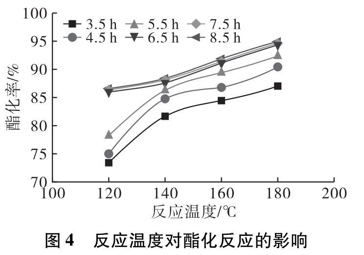 在投料比1∶1,預(yù)熱溫度80℃,預(yù)熱時間5 min,0.4%的4?型分子篩催化劑,分別設(shè)定反應(yīng)溫度為120、140、160、180℃,反應(yīng)時間8.5 h條件下進行酯化反應(yīng)。反應(yīng)3.5 h后每隔1 h取樣測試產(chǎn)物酸價,計算酯化率隨時間的變化,結(jié)果如圖4所示。