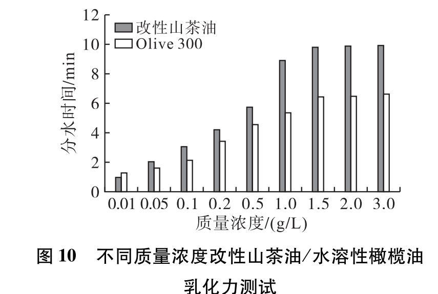 采用分水法對不同質(zhì)量濃度的改性山茶油和水溶性橄欖油(Olive 300)進行乳化力測試,分水時間越長表明乳化性能越好,其結(jié)果如圖10所示。