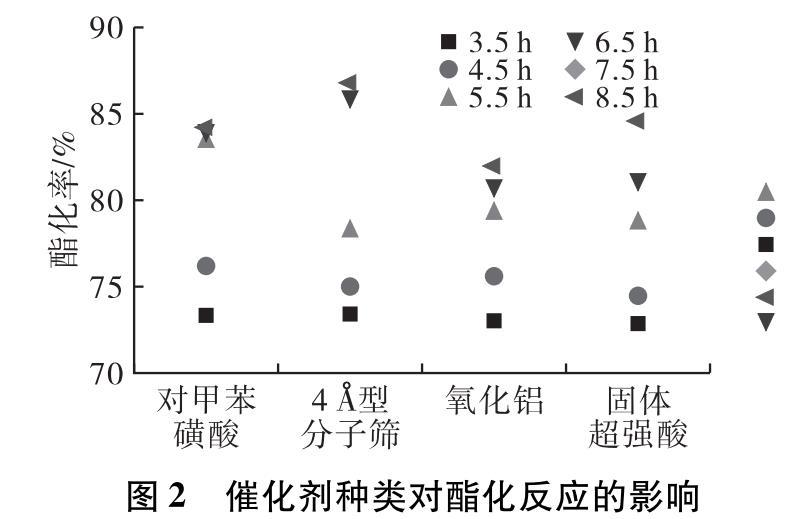 由圖2可知,在相同的工藝條件下4?型分子篩的催化效率高于其他催化劑。原因主要有兩點:首先,4?型分子篩復(fù)雜的孔道結(jié)構(gòu)性相比其他催化劑增加了催化反應(yīng)面積,并且具有較高的活性和穩(wěn)定性;其次,由于試驗過程沒有進行分水處理,導(dǎo)致反應(yīng)產(chǎn)生的水滯留在體系中,體系達到平衡,而4?型分子篩具有一定的吸水作用,可以使平衡向正反應(yīng)方向移動,提高了酯化率。而且在試驗后處理方面,4?型分子篩只需過濾處理,回收后還具有一定的催化活性,可以重復(fù)使用。綜合考慮,最終選擇4?型分子篩作為反應(yīng)的催化劑。