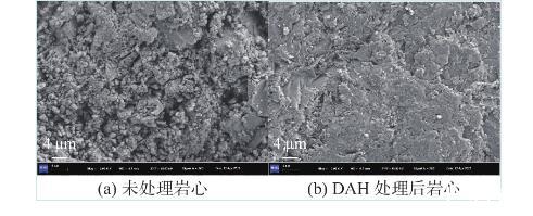 將打磨好的未處理巖心和防水鎖劑DAH處理后的巖心采用掃描電鏡進行測試,結(jié)果如圖9所示。由圖9(a)可知,未處理的巖心表面較為粗糙,存在較多大顆粒與微孔隙,在親水礦物和毛細管力的綜合作用下,巖心表面呈親水性。如圖9(b)所示,DAH處理后的巖心表面更為光滑,微孔隙數(shù)目減少,這是因為防水鎖劑中的DAT分子通過靜電作用在巖心表面吸附形成薄膜。DAT分子兩端的季銨結(jié)構可以通過靜電作用吸附在砂巖表面,中間的聚硅氧烷鏈段具有良好的柔韌性和旋轉(zhuǎn)靈活性,使得DAT分子可以在巖心表面密集覆蓋。同時聚硅氧烷鏈段的柔韌性也使其兩側(cè)的甲基可以高密度堆積,這種堆積使得巖心表面獲得較強的疏水性,從而降低了液相返排阻力,減輕了水鎖損害。