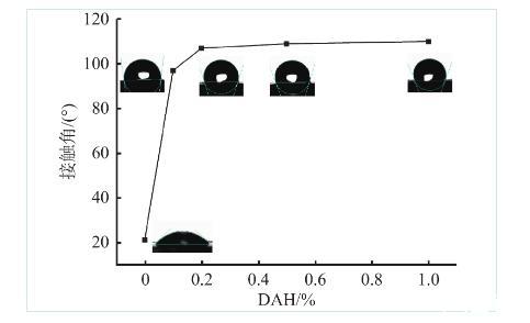 由圖4可知,未處理巖心的潤濕性為水潤濕性,蒸餾水在其表面鋪展,水相接觸角為20°,隨著DAH濃度的增大,處理后的砂巖表面接觸角逐漸增大,當DAH濃度為1%時,砂巖表面接觸角達110°,砂巖表面由親水轉(zhuǎn)變?yōu)槭杷?。上述實驗結(jié)果表明,DAH可以大幅降低水相在巖心表面的黏滯力,降低毛細管力作用,提高水相返排效率,避免水鎖損害的發(fā)生。