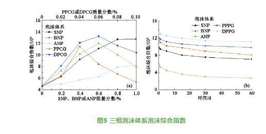 三相泡沫體系泡沫綜合指數見圖5。由圖5(a)可知,隨顆粒質量分數增加,BNP、DPCG或PPCG三相泡沫體系的泡沫綜合指數先增加后降低,而SNP或ANP體系的泡沫綜合指數先快速增加,而后趨于平穩(wěn)。DPCG三相泡沫體系的泡沫綜合指數極大值最大,SNP、BNP或PPCG三相泡沫體系的泡沫綜合指數低于DPCG的,而ANP的最小。由圖5(b)可知,隨時間增加,不同三相泡沫體系的泡沫綜合指數先快速降低,而后趨于平穩(wěn)。DPCG或PPCG三相泡沫體系的泡沫綜合指數大于SNP、BNP或ANP體系的。DPCG或PPCG三相泡沫體系的泡沫綜合指數保留率達84%,其余體系保留率為50%~72%。