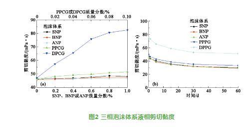 DPCG或PPCG溶于水后,吸水膨脹形成網格結構的軟體內核,外部具有親水支鏈,形成軟體微米顆粒。DPCG或PPCG與DWS和聚合物通過靜電、范德華力和纏繞作用,均勻分布在液相中。PPCG僅具有短親水支鏈,使其三相泡沫體系液相剪切黏度略增加;而DPCG具有長親水支鏈,使其三相泡沫體系液相剪切黏度明顯增加。SNP、BNP或ANP為硬質納米顆粒,對其三相泡沫體系液相剪切黏度不產生影響。隨時間增加,軟體微米顆粒溶脹更充分,對體系剪切黏度的貢獻更大;而硬質納米顆粒體系的剪切黏度主要為聚合物黏度的宏觀體現。DPCG或PPCG體系的剪切黏度保留率高于SNP、BNP或ANP的。