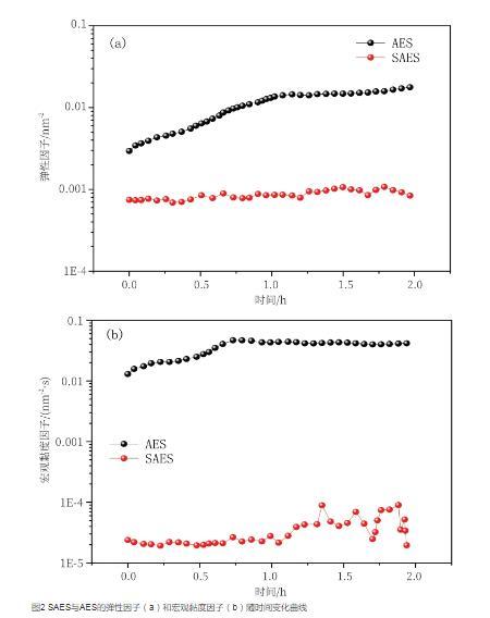圖2 SAES與AES的彈性因子(a)和宏觀黏度因子(b)隨時(shí)間變化曲線