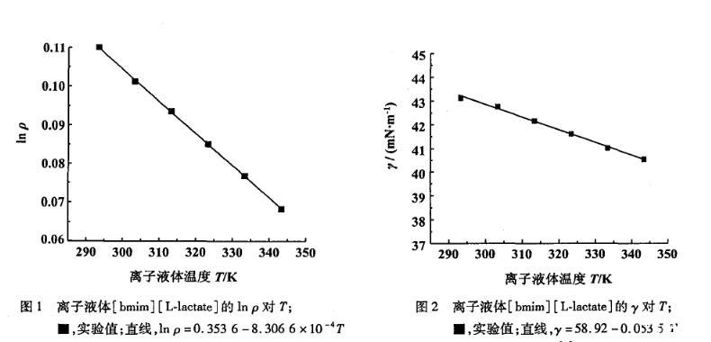 在293.15~343.15 K溫度范圍內(nèi)實(shí)驗(yàn)測得的離子液體[bmim][L-lactate]的表面張力值隨溫度的升高而減小(圖2),并且得到表面張力的經(jīng)驗(yàn)方程: