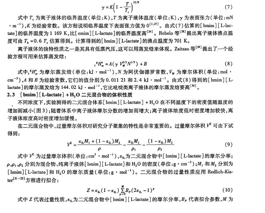 離子液體的獨(dú)特性質(zhì)之一是其具有低蒸汽壓,這可以用蒸發(fā)焓來體現(xiàn)。Zaitsau等提出了一個(gè)經(jīng)驗(yàn)方程可用來估算蒸發(fā)焓: