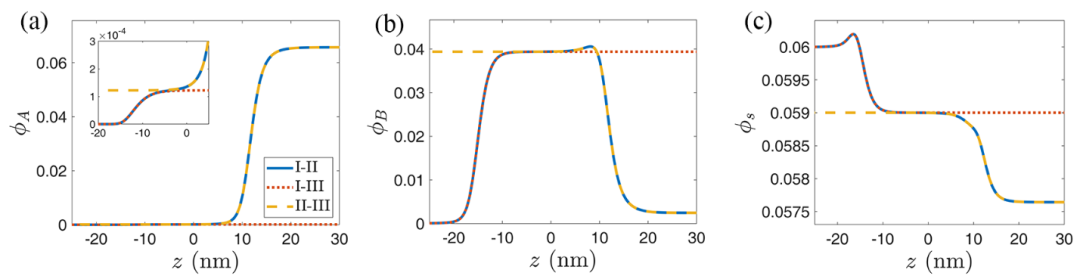 圖2.I-II相界面處的物種濃度分布曲線與I-III相界面和II-III相界面的濃度分布曲線對比。藍(lán)色實(shí)線為I-II相界面的濃度分布曲線,左側(cè)為I相,右側(cè)為II相;紅色點(diǎn)線I-III相界面的濃度分布曲線,左側(cè)為I相,右側(cè)為III相;黃色虛線為II-III相界面的濃度分布曲線,左側(cè)為III相,右側(cè)為II相。