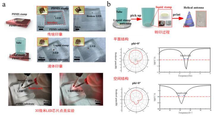 當(dāng)液體印章與待轉(zhuǎn)印器件/單元結(jié)合時,液滴對器件進行包裹,進而實現(xiàn)保護器件的作用。相比于傳統(tǒng)彈性印章轉(zhuǎn)印方法,液體的流變特性充分發(fā)揮作用,使得薄膜器件更容易轉(zhuǎn)印到多種復(fù)雜的空間曲面上。通過對固-液界面粘附力的理論分析,提出了基于液滴印章的轉(zhuǎn)印技術(shù),實現(xiàn)了柔性薄膜的高度精確可控轉(zhuǎn)印,并通過實驗證實了理論模型的正確性與該轉(zhuǎn)印方法的可行性。研究人員通過液體印章轉(zhuǎn)印方法,成功實現(xiàn)了30微米超薄LED芯片的轉(zhuǎn)印集成(圖2a為傳統(tǒng)印章和液滴印章轉(zhuǎn)印對超薄LED芯片轉(zhuǎn)印結(jié)果的對比)與錐螺旋微天線與異形曲面的轉(zhuǎn)印集成(圖2b)。此方法利用了表面張力和毛細作用,可以實現(xiàn)轉(zhuǎn)印期間印章-薄膜作用力的精確調(diào)控,進而能夠高效、高質(zhì)量地完成超薄器件的轉(zhuǎn)??;利用二維制備工藝和轉(zhuǎn)印技術(shù),實現(xiàn)了立體空間微結(jié)構(gòu)和異形界面的集成,為曲面電子器件的設(shè)計與制備提供了一種新的方案。