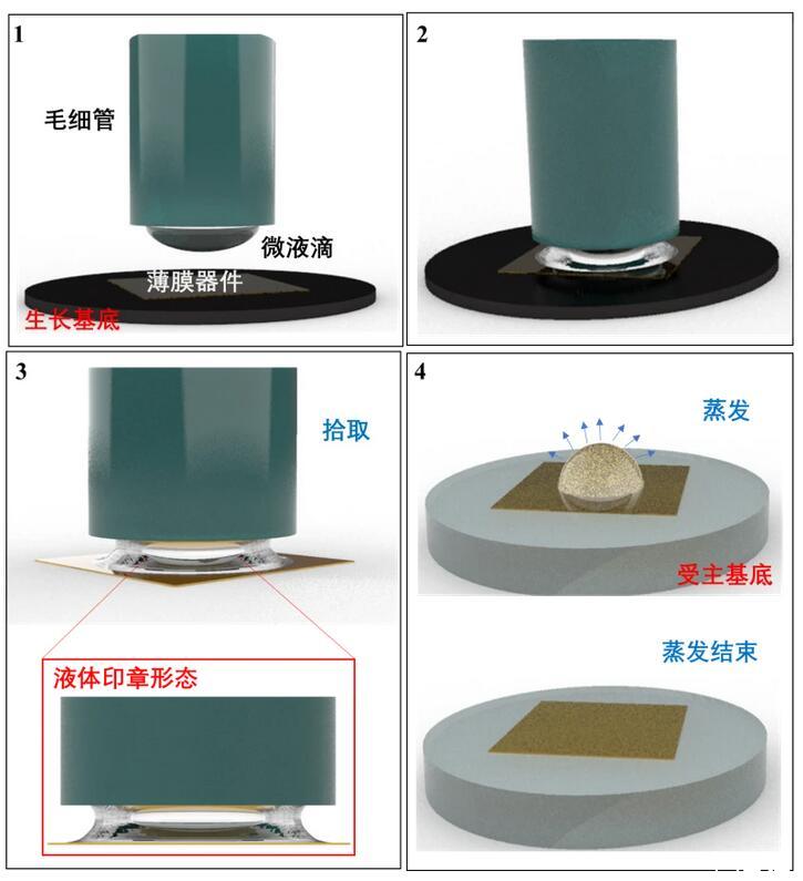 針對當(dāng)前轉(zhuǎn)印技術(shù)中存在的問題,研究人員結(jié)合接觸式和非接觸式轉(zhuǎn)印的特點,提出了一種基于表面張力的液滴轉(zhuǎn)印方法,利用液體的流變特性,通過毛細管對液滴形態(tài)的控制,調(diào)控固-液界面的粘附力,從而實現(xiàn)柔性器件的轉(zhuǎn)印,該方法減少了超薄柔性器件的轉(zhuǎn)印過程中印章對器件的損傷,同時也為曲面電子器件的制造提供了新的思路。