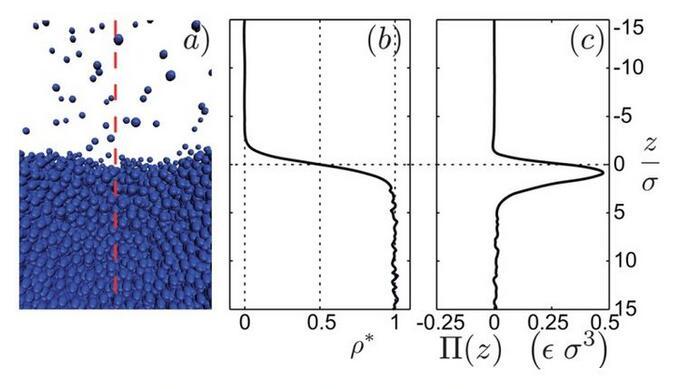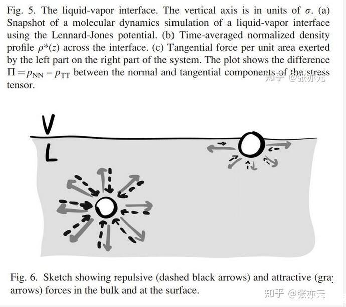 當(dāng)分子間距較小時(shí),斥力為主,分子間距較大時(shí),引力為主。在斥力與引力平衡時(shí),Lennard-Jones勢(shì)能最小?,F(xiàn)在,我們就可以來詳細(xì)地考慮液-氣界面了。圖5a是通過分子動(dòng)力學(xué)仿真得出的液-氣界面照片,對(duì)應(yīng)的時(shí)間平均密度分布圖是圖5b。從高密度的液體到低密度的氣體發(fā)生在一個(gè)幾個(gè)分子厚度的窄區(qū)域。為了確定毛細(xì)力,我們沿垂直界面方向?qū)⑾到y(tǒng)分為兩個(gè)子系統(tǒng)(圖5a)??紤]左邊子系統(tǒng)對(duì)右邊子系統(tǒng)的單位面積的作用力,即應(yīng)力,在豎直方向上的分布。這個(gè)力有兩個(gè)來源:壓力P和額外壓力Π(圖5c)。圖5c表明有個(gè)力局部存在于界面附近,其實(shí)這個(gè)力就是表面張力,且這個(gè)力范圍和密度突變的范圍很相似。這說明表面張力的確是一個(gè)真實(shí)的力,而不僅僅是表面能的一種純數(shù)學(xué)描述。既然我們發(fā)現(xiàn)在界面附近的確局部存在一個(gè)平行的力,那我們回到問題1,為什么表面張力平行于界面而不是垂直于界面?我們注意到圖1僅僅描繪了分子間引力作用。更全面的圖應(yīng)該如圖6所示,包含了引力與斥力作用。在遠(yuǎn)離界面的液體本體內(nèi),由于液體分子周圍的完全對(duì)稱性,分子的受力完全平衡。但是,靠近界面附近的地方,上下對(duì)稱性被打破。為修復(fù)豎直方向的力平衡,向上的斥力需平衡向下的引力。而在平行于界面的方向,對(duì)稱性仍然存在,平行于界面方向的力平衡仍然存在。這就可以存在一種情況,引力作用的強(qiáng)度與斥力作用的強(qiáng)度不同。實(shí)際上,在界面附近的水平方向上,引力作用比斥力更強(qiáng),這產(chǎn)生了表面張力。