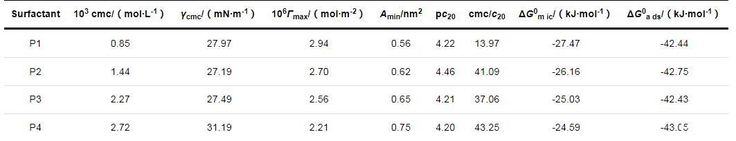 利用ΔG0a ds和ΔG0m ic表征表面活性劑的熱力學性質。P1,P2,P3和P4的ΔG0a ds和ΔG0m ic均小于0,說明表面活性劑在氣/液界面層上的吸附行為以及在水溶液中形成膠束的行為是自發(fā)進行的。4種表面活性劑的ΔG0a ds均小于ΔG0m ic,表明表面活性劑分子在溶液中會先形成吸附層,當氣/液界面吸附達到飽和狀態(tài)后才開始在溶液內(nèi)部形成膠束聚集體。