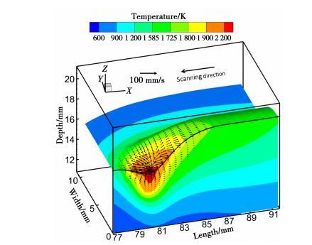 電弧壓力是形成熔池凹陷區(qū)的驅(qū)動力。熔池中心表面的液態(tài)金屬受到較大的壓力,向周圍移動。液態(tài)金屬在熔池中心區(qū)域流速最大,而越靠近熔池底部流速越小。這種流動模式允許更多的熱量從熱源傳遞到熔池底部,從而導(dǎo)致深度滲透。如圖2所示,液態(tài)金屬在電弧壓力的驅(qū)動下被推到熔池的后部,并在凝固時形成冠狀。