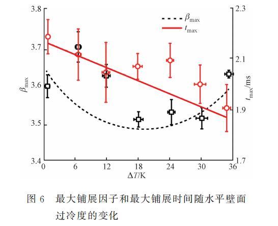 根據(jù)液滴鋪展隨時(shí)間的變化,提取了不同過(guò)冷度下的βmax和tmax并繪制了圖6。如圖所示:隨著水平壁面過(guò)冷度的增大,βmax呈現(xiàn)了先減小后增大的非單調(diào)變化趨勢(shì),并在水平壁面過(guò)冷度為18.0~30.0K時(shí)達(dá)到最小值;不同于βmax的變化趨勢(shì),tmax呈現(xiàn)逐漸減小的趨勢(shì),這是由于隨著水平壁面過(guò)冷度的增加,換熱加劇,液滴的溫度降低,這使得密度、黏度、表面張力增加,抑制了最大鋪展時(shí)間。根據(jù)Shang等提出的換熱模型,將乙醇液滴看作一個(gè)整體,并將液滴沖擊過(guò)冷水平壁面的過(guò)程看作圓柱形不斷“變矮”和“變寬”的過(guò)程,可以得到乙醇液滴沖擊過(guò)冷水平壁面的溫度降低范圍為1.8~3.7K。