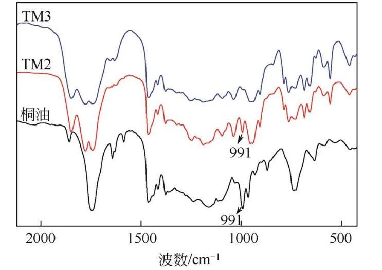 桐油中的共軛不飽和鍵與馬來酸酐易發(fā)生Diels-Alder(D-A)反應(yīng),生成桐油酸酐,反應(yīng)條件對產(chǎn)物的分布具有重要影響。由于桐油為混合物,每分子中有3條不飽和鏈,控制MA的加入量及反應(yīng)條件,可以控制桐油二酸酐(TM2)和桐油三酸酐(TM3)的形成。文獻報道大多數(shù)桐油和馬來酸酐反應(yīng)以有機錫為催化劑,經(jīng)過研究發(fā)現(xiàn),溫度對馬來酸酐與桐油反應(yīng)影響較大,溫度低反應(yīng)很慢,有機錫催化劑并不能明顯降低反應(yīng)溫度。在無催化劑的條件下,以紅外光譜跟蹤80℃、100℃、120℃及140℃下桐油與3倍量的馬來酸酐反應(yīng)的情況,結(jié)果表明80℃下反應(yīng)緩慢,100℃反應(yīng)1h后桐油的共軛三鍵的紅外吸收峰幾乎完全消失,反應(yīng)程度能達到96%。桐油及桐油酸酐的FTIR如圖1所示,991cm–1為桐油共軛三鍵的面外彎曲振動紅外吸收峰,兩倍量馬來酸酐與桐油反應(yīng)的產(chǎn)物(TM2)中991cm–1的吸收峰明顯減弱但未消失,3倍量馬來酸酐與桐油反應(yīng)的產(chǎn)物中該峰完全消失,說明桐油分子上的共軛三鍵可以同馬來酸酐反應(yīng)形成三酸酐TM3。