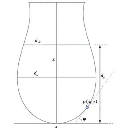 懸滴法測定液體的表面和界面張力原理見圖5。其中,de為懸滴最大直徑;d10為離頂點距離為de處懸滴截面直徑。