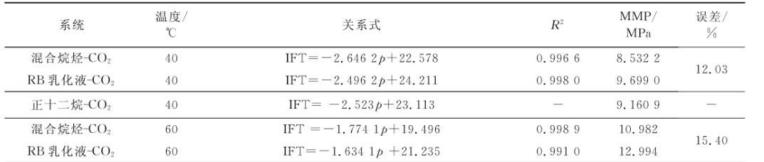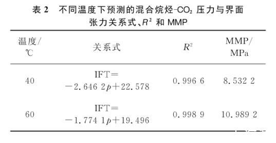 將擬合直線向橫軸方向繼續(xù)延伸,與壓力軸會(huì)有一個(gè)交點(diǎn),該交點(diǎn)的物理意義即界面張力為零時(shí)的壓力大小。根據(jù)CO2的驅(qū)油機(jī)理和最小混相壓力所表現(xiàn)的特征,該點(diǎn)的橫坐標(biāo)值即為實(shí)驗(yàn)對(duì)象在特定溫度下的MMP。表2列出了40℃和60℃下所測(cè)氣液之間的壓力與界面張力的關(guān)系式和相關(guān)系數(shù),以及對(duì)最小混相壓力的預(yù)測(cè)。