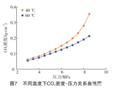 (3)溫度對(duì)界面張力隨壓力的影響存在一個(gè)關(guān)鍵壓力點(diǎn)。在實(shí)驗(yàn)壓力為3.5 MPa之前,40℃的界面張力值要高一些;在3.5 MPa之后,60℃的界面張力值更高。通過分析得出,在關(guān)鍵壓力點(diǎn)之前,溫度的熱效應(yīng)占主導(dǎo)作用;關(guān)鍵壓力點(diǎn)之后,溫度通過影響氣體密度和氣液密度差間接地影響界面張力值,取代溫度的熱效應(yīng)而成為主導(dǎo)因素。