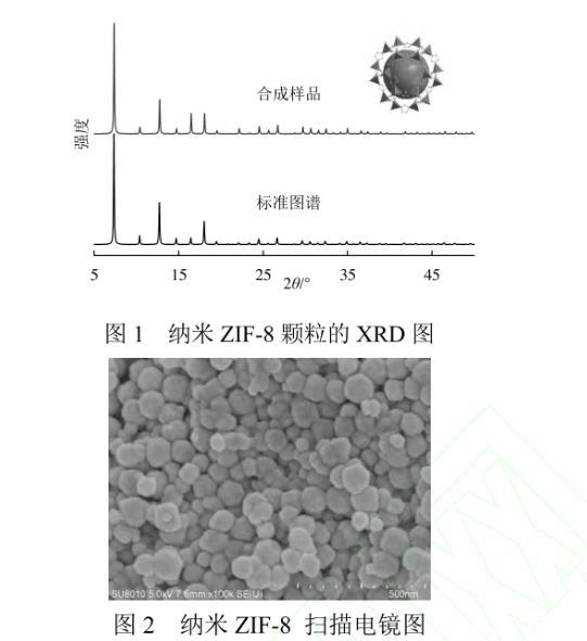 納米ZIF-8顆粒的XRD譜圖如圖1所示。合成的樣品譜圖分布與標準譜圖匹配,且所獲得的衍射峰與文獻吻合,未出現(xiàn)雜峰,表明制備的樣品具有單一相且結晶度良好。由謝樂公式計算得到晶粒尺寸約為70 nm。由納米ZIF-8顆粒的掃描電鏡照片可見,ZIF-8顆粒形貌為六邊形,平均尺寸為65.8 nm,與XRD計算結果一致。
