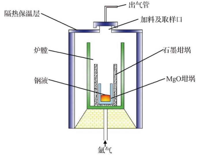 將重軌鋼鑄坯切成20 mm×15 mm×10 mm的鋼塊并打磨氧化皮,每爐試驗(yàn)取約300 g鋼塊疊放在MgO質(zhì)量分?jǐn)?shù)為99.5%的坩堝中,并隨石墨坩堝一同放置在管式電阻爐中,調(diào)好程序緩慢加熱升溫,試驗(yàn)裝置如圖1所示。當(dāng)溫度升至600℃時(shí),氬氣(質(zhì)量分?jǐn)?shù)為99.99%)流量控制為2.5 L/min,保持坩堝內(nèi)中性氣氛,當(dāng)溫度升至900℃時(shí),氬氣流量調(diào)整為3.5 L/min,爐膛升溫至1 600℃后持續(xù)保溫30 min以保證鋼液熔化且均勻。