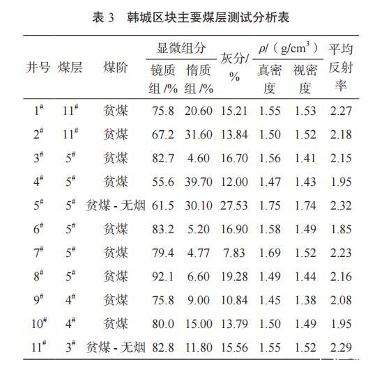 對表3綜合分析可得,韓城主要目的煤層以貧煤和貧煤-無煙煤為主,屬于中高階煤,含氣量較高;相同的演化條件下,惰質(zhì)組產(chǎn)氣率最低,鏡質(zhì)組產(chǎn)氣率是惰質(zhì)組的4.3倍。說明韓城區(qū)塊鏡質(zhì)組的含量相對比較高,含氣量較好,通過合理壓裂改造能獲得較好的產(chǎn)能;各井組的同一層系間差異較大,韓城區(qū)塊煤層的非均質(zhì)性非常強。