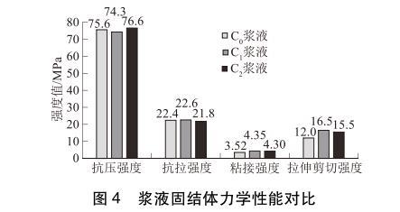 3種漿液固結(jié)體力學性能對比見圖4。由圖4可以看出:3種漿液固結(jié)體抗壓強度和抗拉強度數(shù)值差別不大,說明表面活性劑對漿液固結(jié)體的抗壓強度和抗拉強度無影響。但C1、C2漿液的粘接強度和拉伸剪切強度明顯高于C0漿液的粘接強度和拉伸剪切強度。其中C1漿液的粘接強度和拉伸剪切強度比C0漿液分別提高了23.6%和37.5%;C2漿液的粘接強度和拉伸剪切強度比C0漿液分別提高了22.2%和29.2%。其原因在于表面活性劑的加入降低了漿液的接觸角,使?jié){液有更好的浸潤性和潤濕性,從而提高了漿液的粘接強度和拉伸剪切強度。