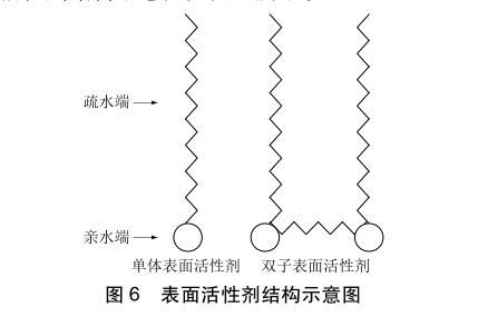 從圖3中可以看出加入表面活性劑S1、S2能降低漿液的表面張力和接觸角。這是因為本次漿液改性選用的表面活性劑S1、S2從化學結(jié)構(gòu)上屬于雙子型非離子表面活性劑。傳統(tǒng)表面活性劑和雙子型表面活性劑結(jié)構(gòu)示意圖如圖6所示。