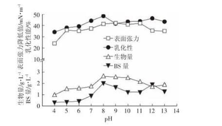 圖5 pH對147細菌生長以及生物表面活性劑產(chǎn)量的影響