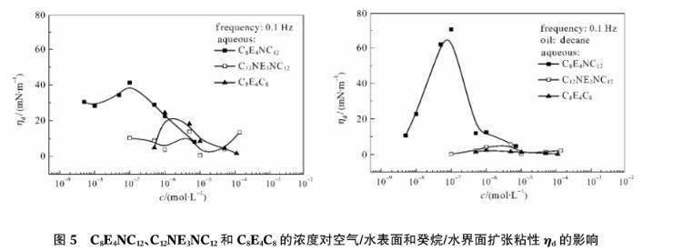 圖5 C8E4NC12、C12NE3NC12和C8E4C8的濃度對空氣/水表面和癸烷/水界面擴張粘性ηd的影響