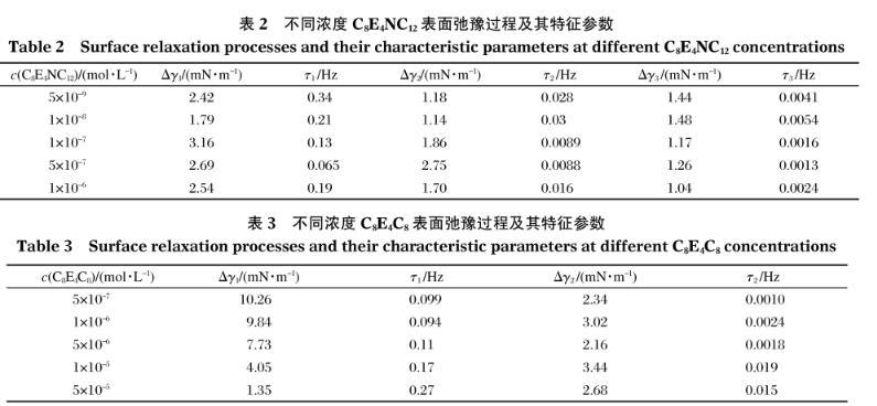 表2不同濃度C8E4NC12表面弛豫過程及其特征參數(shù)