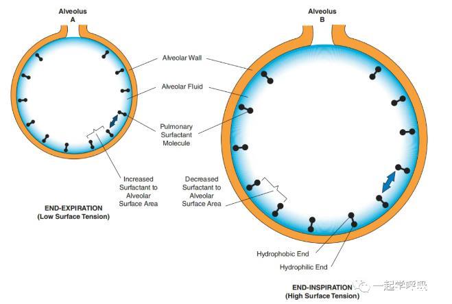 肺表面活性物質(zhì)(Pulmonary surfactant,PS)是由II型肺泡上皮細(xì)泡合成和分泌的一種磷脂蛋白混合物,由磷脂(約90%)和蛋白質(zhì)(約10%)組成。肺表面活性劑中主要的表面張力化學(xué)物質(zhì)是二棕櫚酰磷脂酰膽堿(Dipal mitoyl phosphatidylcholine,DPPC)。DPPC分子既有疏水(水不溶性)端,也有親水(水溶性)端。這種獨(dú)特的疏水/親水結(jié)構(gòu)使DPPC分子定位于肺泡氣液界面,使親水端朝向液相,疏水端朝向氣相。肺泡氣液界面的DPPC分子導(dǎo)致表面張力按其與肺泡表面積的比值成比例下降。當(dāng)肺泡尺寸減小(呼氣)時(shí),DPPC占肺泡表面積的比例增加,從而增加DPPC分子的作用,并導(dǎo)致肺泡表面張力降低。相反,當(dāng)肺泡尺寸增加(吸入)時(shí),DPPC相對(duì)于肺泡表面積的含量減少(因?yàn)楫?dāng)肺泡大小變化時(shí)表面活性劑分子的數(shù)量不變),從而降低DPPC分子的作用并導(dǎo)致肺泡表面張力增加。
